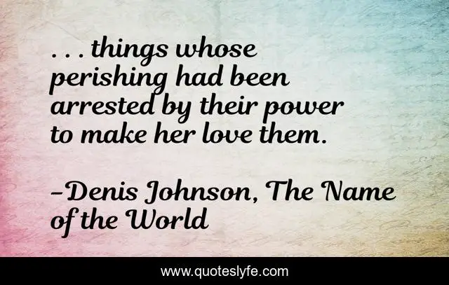 This page presents the quote ". . . things whose perishing had been arrested by their power to make her love them.". Author of this quote is Denis Johnson, The Name of the World. This quote is about death, love, remember, human, memory, remembrance, affection, perish,.
