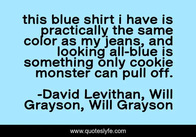 This page presents the quote "this blue shirt i have is practically the same color as my jeans, and looking all-blue is something only cookie monster can pull off.". Author of this quote is David Levithan, Will Grayson, Will Grayson. This quote is about cookie-monster, fashion, jeans,.
