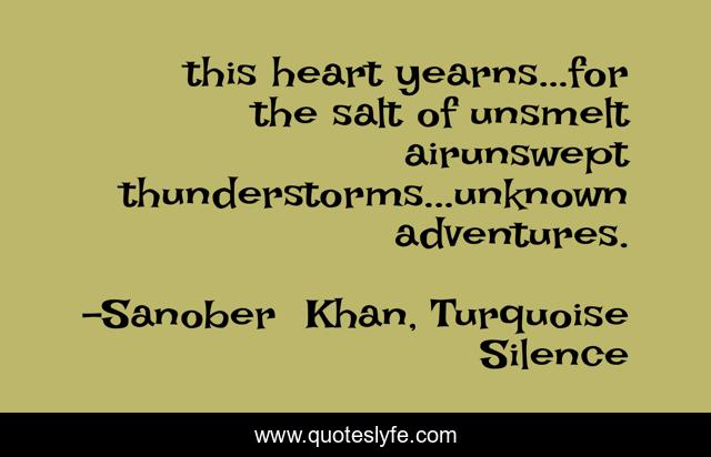 This page presents the quote "this heart yearns...for the salt of unsmelt airunswept thunderstorms...unknown adventures.". Author of this quote is Sanober Khan, Turquoise Silence. This quote is about heart, life, longing, indian-authors, adventures, alive, air, yearning, sweep,.