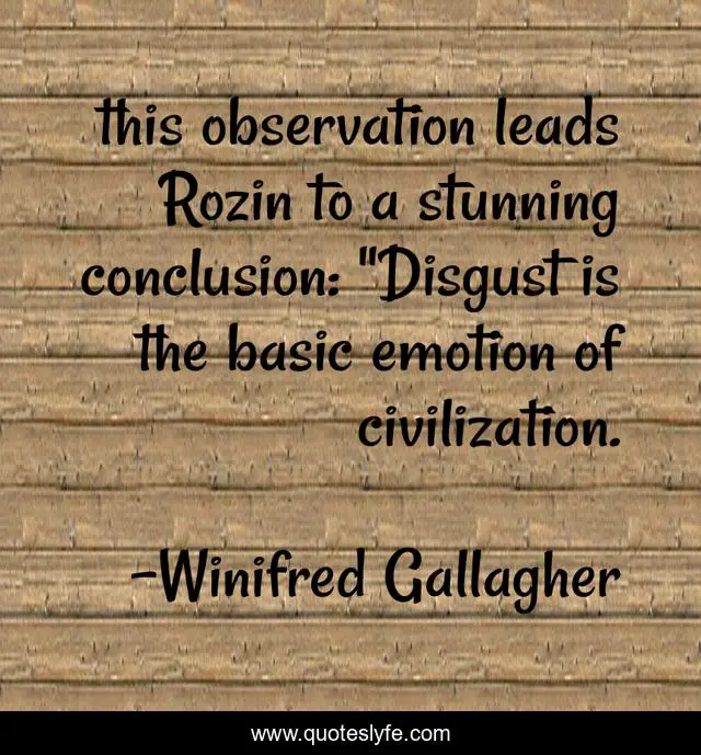 This page presents the quote "this observation leads Rozin to a stunning conclusion: "Disgust is the basic emotion of civilization.". Author of this quote is Winifred Gallagher. This quote is about attention, civilization, focus,.