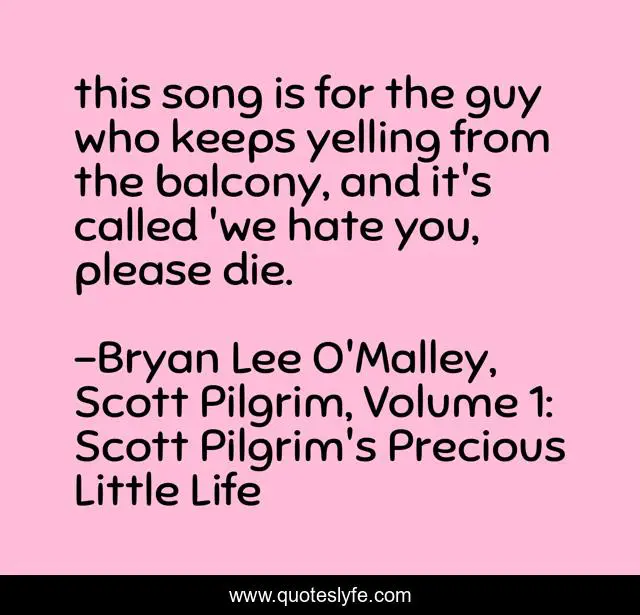 This page presents the quote "this song is for the guy who keeps yelling from the balcony, and it's called 'we hate you, please die.". Author of this quote is Bryan Lee O'Malley, Scott Pilgrim, Volume 1: Scott Pilgrim's Precious Little Life. This quote is about scott-pilgrim, awesomeness, music,.