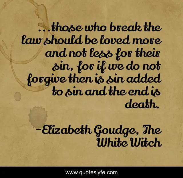 This page presents the quote "...those who break the law should be loved more and not less for their sin, for if we do not forgive then is sin added to sin and the end is death.". Author of this quote is Elizabeth Goudge, The White Witch. This quote is about faith, love, forgiveness, sin, affection,.