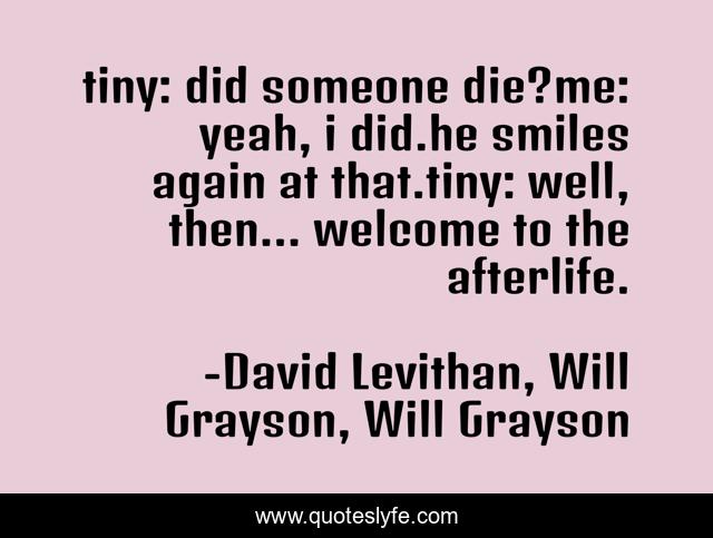 This page presents the quote "tiny: did someone die?me: yeah, i did.he smiles again at that.tiny: well, then... welcome to the afterlife.". Author of this quote is David Levithan, Will Grayson, Will Grayson. .