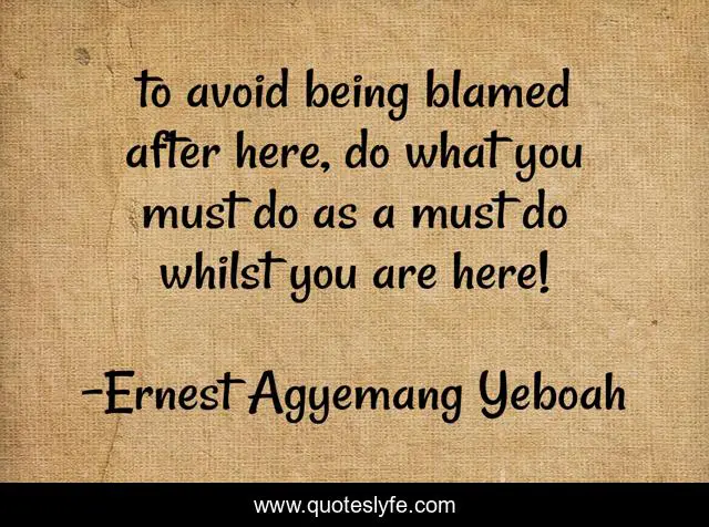 This page presents the quote "to avoid being blamed after here, do what you must do as a must do whilst you are here!". Author of this quote is Ernest Agyemang Yeboah. This quote is about blame, do-something, footprints, daily-life, living-life, inspirational, attitude-toward-life, enthusiasm, daily-living,.