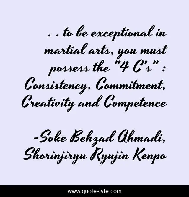 This page presents the quote ". . to be exceptional in martial arts, you must possess the "4 C's" : Consistency, Commitment, Creativity and Competence". Author of this quote is Soke Behzad Ahmadi, Shorinjiryu Ryujin Kenpo. This quote is about combat, exceptional, kenpo, budo, commitment, okinawa, shorinjiryu, compete, martial-arts-training,.