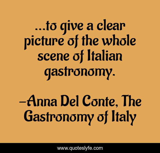This page presents the quote "...to give a clear picture of the whole scene of Italian gastronomy.". Author of this quote is Anna Del Conte, The Gastronomy of Italy. This quote is about food, italy,.