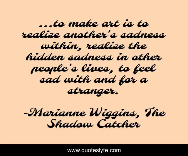 This page presents the quote "...to make art is to realize another's sadness within, realize the hidden sadness in other people's lives, to feel sad with and for a stranger.". Author of this quote is Marianne Wiggins, The Shadow Catcher. This quote is about sadness, empathy, art,.