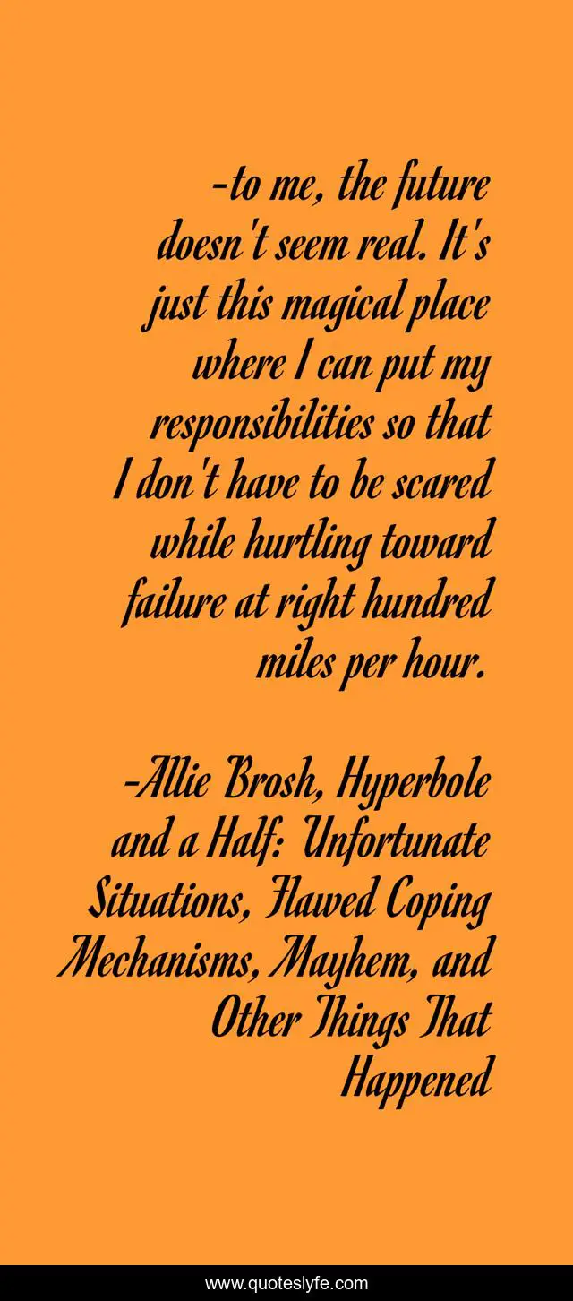 This page presents the quote "-to me, the future doesn't seem real. It's just this magical place where I can put my responsibilities so that I don't have to be scared while hurtling toward failure at right hundred miles per hour.". Author of this quote is Allie Brosh, Hyperbole and a Half: Unfortunate Situations, Flawed Coping Mechanisms, Mayhem, and Other Things That Happened. This quote is about failure, fear, motivation,.