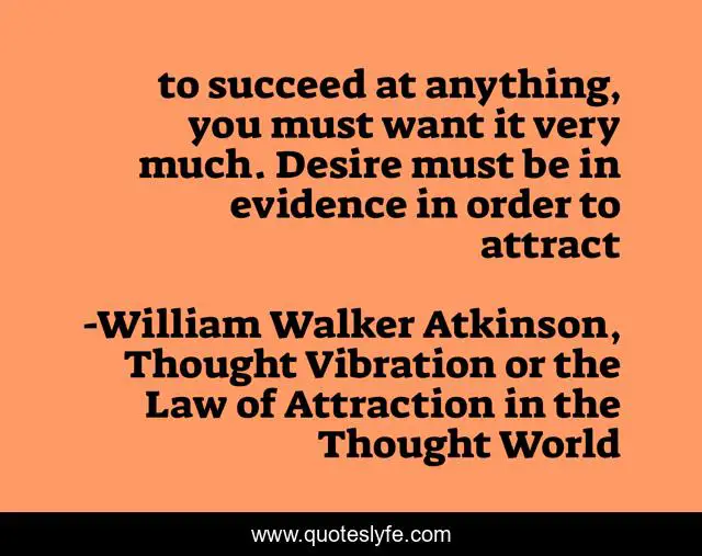 This page presents the quote "to succeed at anything, you must want it very much. Desire must be in evidence in order to attract". Author of this quote is William Walker Atkinson, Thought Vibration or the Law of Attraction in the Thought World. This quote is about desire, law-of-attraction, success,.