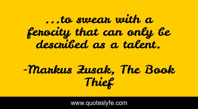 This page presents the quote "...to swear with a ferocity that can only be described as a talent.". Author of this quote is Markus Zusak, The Book Thief. This quote is about cuss, ferocity, curse, language,.