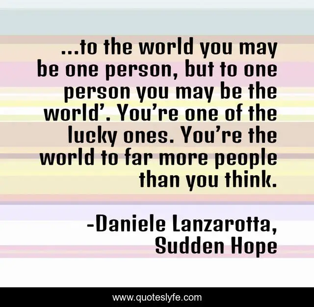 This page presents the quote "...to the world you may be one person, but to one person you may be the world’. You’re one of the lucky ones. You’re the world to far more people than you think.". Author of this quote is Daniele Lanzarotta, Sudden Hope. This quote is about ya, yalit, sudden-hope, young-adult,.