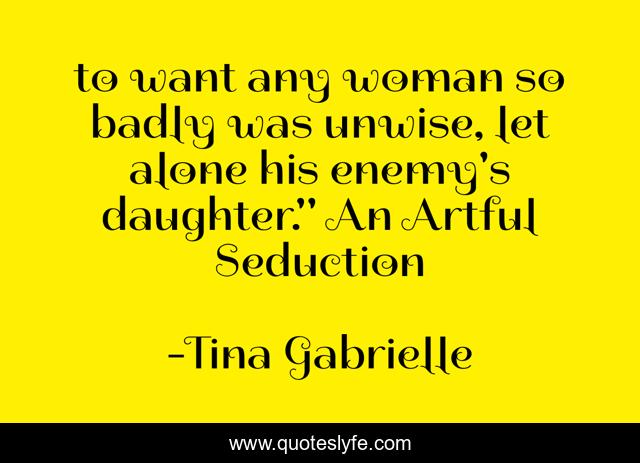 This page presents the quote "to want any woman so badly was unwise, let alone his enemy's daughter." An Artful Seduction". Author of this quote is Tina Gabrielle. This quote is about regency-romance, romance, historical-romance,.