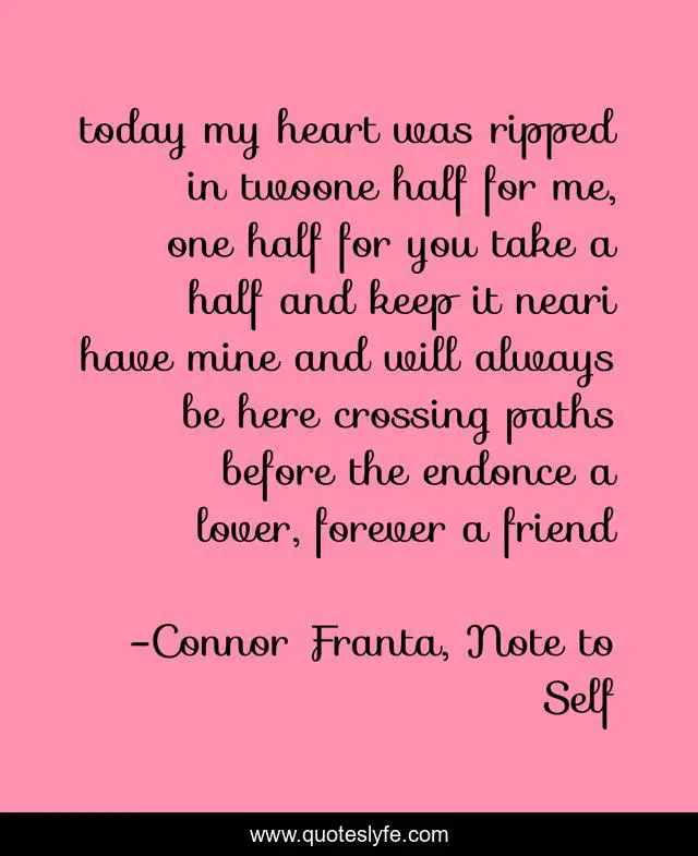 This page presents the quote "today my heart was ripped in twoone half for me, one half for you take a half and keep it neari have mine and will always be here crossing paths before the endonce a lover, forever a friend". Author of this quote is Connor Franta, Note to Self. This quote is about heart, love, poetry, note-to-self, hope, truth, affection, connor-franta,.