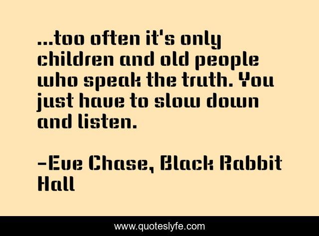 This page presents the quote "...too often it's only children and old people who speak the truth. You just have to slow down and listen.". Author of this quote is Eve Chase, Black Rabbit Hall. This quote is about old-people, children, truth,.