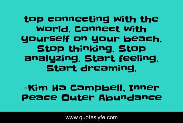 This page presents the quote "top connecting with the world. Connect with yourself on your beach. Stop thinking. Stop analyzing. Start feeling. Start dreaming.". Author of this quote is Kim Ha Campbell, Inner Peace Outer Abundance. This quote is about inner-peace-outer-abundance, inner-child, author, dreaming, kim-ha-campbell, connecting, listening, beach-success-system, feeling,.