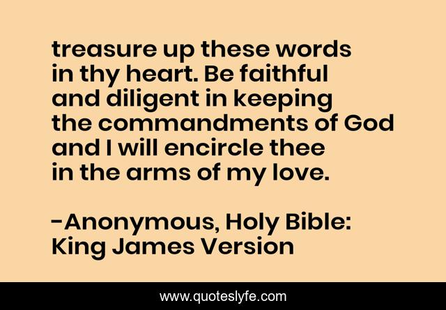 This page presents the quote "treasure up these words in thy heart. Be faithful and diligent in keeping the commandments of God and I will encircle thee in the arms of my love.". Author of this quote is Anonymous, Holy Bible: King James Version. This quote is about lds, enthusiasm, religious, uplifting, inspirational,.