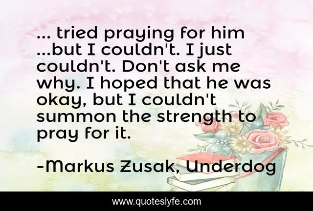 This page presents the quote "... tried praying for him ...but I couldn't. I just couldn't. Don't ask me why. I hoped that he was okay, but I couldn't summon the strength to pray for it.". Author of this quote is Markus Zusak, Underdog. This quote is about self-awareness, honesty, self-awareness-honesty-self,.