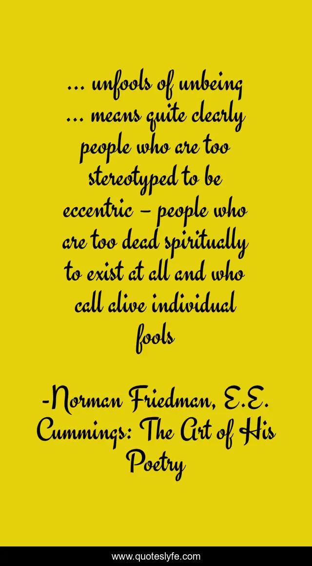 This page presents the quote "... unfools of unbeing ... means quite clearly people who are too stereotyped to be eccentric – people who are too dead spiritually to exist at all and who call alive individual fools". Author of this quote is Norman Friedman, E.E. Cummings: The Art of His Poetry. This quote is about spirituality, individuals, stereotypes, poetry,.