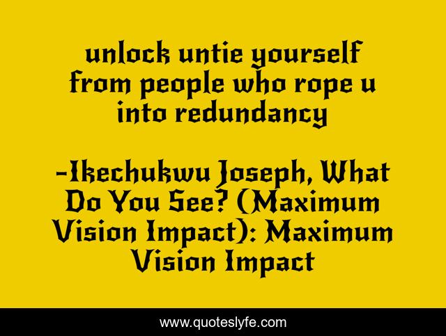 This page presents the quote "unlock untie yourself from people who rope u into redundancy". Author of this quote is Ikechukwu Joseph, What Do You See? (Maximum Vision Impact): Maximum Vision Impact. This quote is about christianity, self-identity, discovery,.