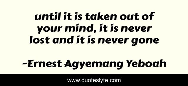 This page presents the quote "until it is taken out of your mind, it is never lost and it is never gone". Author of this quote is Ernest Agyemang Yeboah. This quote is about forgetfulness, life, pain, joy, actions-over-words, living-well, betrayal, out-of-the-mind, the-past,.
