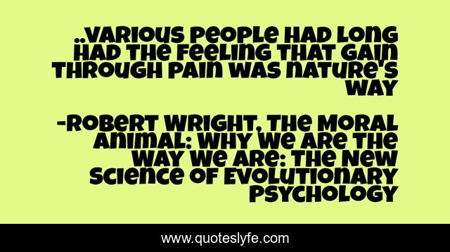This page presents the quote "..various people had long had the feeling that gain through pain was nature's way". Author of this quote is Robert Wright, The Moral Animal: Why We Are the Way We Are: The New Science of Evolutionary Psychology. This quote is about pain, gain, psychology,.