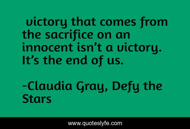 This page presents the quote "…victory that comes from the sacrifice on an innocent isn’t a victory. It’s the end of us.". Author of this quote is Claudia Gray, Defy the Stars. This quote is about sacrifice, victory, innocent,.