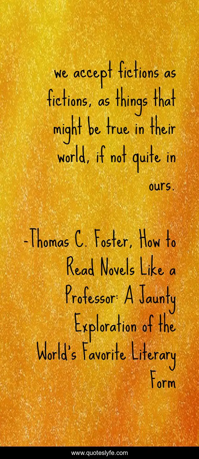 This page presents the quote "we accept fictions as fictions, as things that might be true in their world, if not quite in ours.". Author of this quote is Thomas C. Foster, How to Read Novels Like a Professor: A Jaunty Exploration of the World’s Favorite Literary Form. .