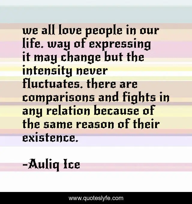 This page presents the quote "we all love people in our life. way of expressing it may change but the intensity never fluctuates. there are comparisons and fights in any relation because of the same reason of their existence.". Author of this quote is Auliq Ice. This quote is about love, relationship, friendship, alikkais, happiness, forgiveness, affection, auliq-ice,.