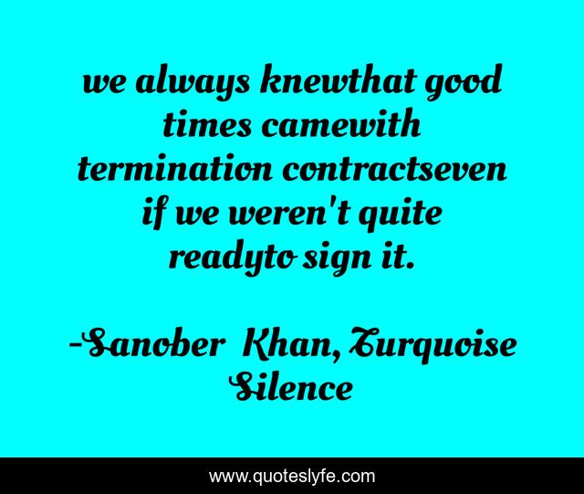 "Sanober Khan, Turquoise Silence Quotes." Quoteslyfe.com, 2025. Sat. 06 Dec. 2025. <https://www.quoteslyfe.com/quote/we-always-knewthat-good-times-camewith-termination-86513>.
