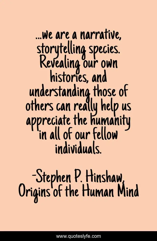 "Stephen P. Hinshaw, Origins of the Human Mind Quotes." Quoteslyfe.com, 2025. Tue. 09 Dec. 2025. <https://www.quoteslyfe.com/quote/we-are-a-narrative-storytelling-species-Revealing-103508>.
