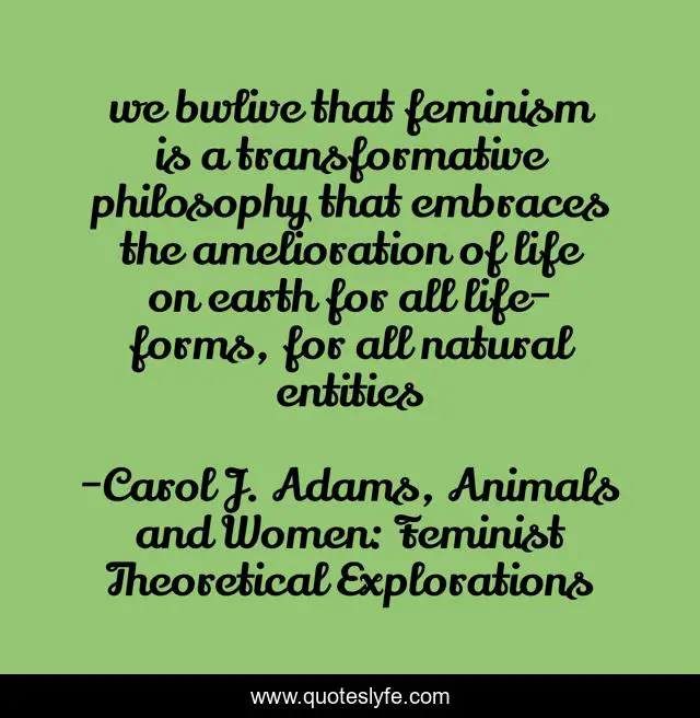This page presents the quote "we bwlive that feminism is a transformative philosophy that embraces the amelioration of life on earth for all life-forms, for all natural entities". Author of this quote is Carol J. Adams, Animals and Women: Feminist Theoretical Explorations. .