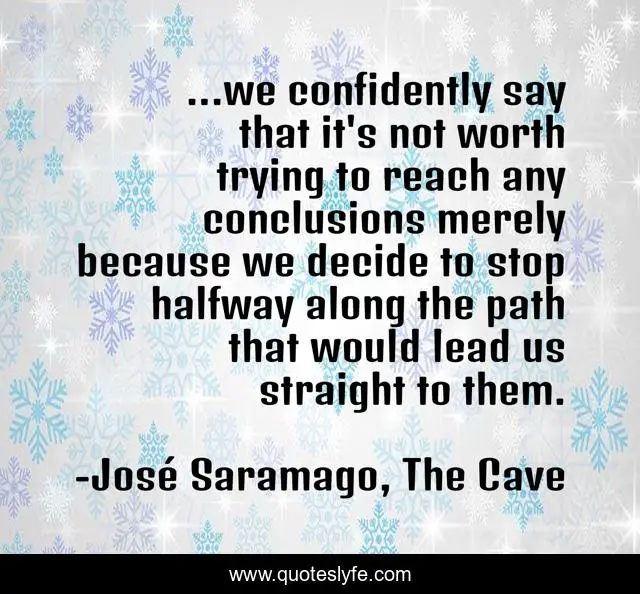 This page presents the quote "...we confidently say that it's not worth trying to reach any conclusions merely because we decide to stop halfway along the path that would lead us straight to them.". Author of this quote is José Saramago, The Cave. This quote is about fear, decisions,.