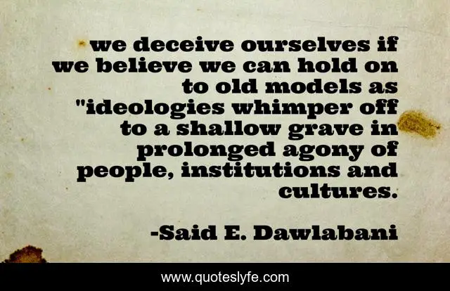 This page presents the quote "we deceive ourselves if we believe we can hold on to old models as "ideologies whimper off to a shallow grave in prolonged agony of people, institutions and cultures.". Author of this quote is Said E. Dawlabani. This quote is about culture, economics, values, memenomics,.