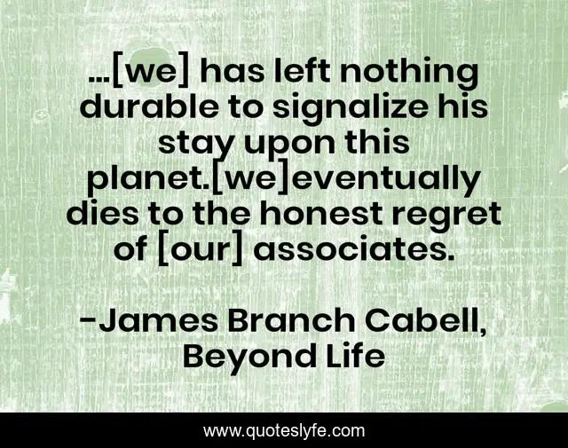 This page presents the quote "...[we] has left nothing durable to signalize his stay upon this planet.[we]eventually dies to the honest regret of [our] associates.". Author of this quote is James Branch Cabell, Beyond Life. This quote is about death, dying, cynicism,.