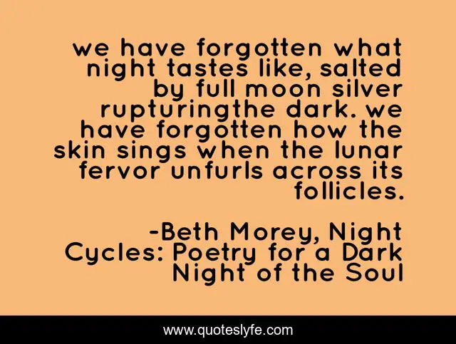 This page presents the quote "we have forgotten what night tastes like, salted by full moon silver rupturingthe dark. we have forgotten how the skin sings when the lunar fervor unfurls across its follicles.". Author of this quote is Beth Morey, Night Cycles: Poetry for a Dark Night of the Soul. This quote is about dark, poem, moon, poetry, night,.