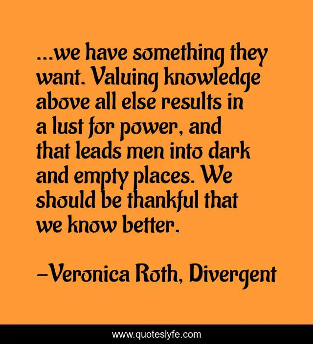 This page presents the quote "...we have something they want. Valuing knowledge above all else results in a lust for power, and that leads men into dark and empty places. We should be thankful that we know better.". Author of this quote is Veronica Roth, Divergent. This quote is about knowledge, greed, divergent,.