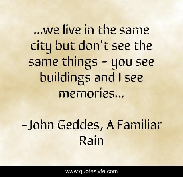 This page presents the quote "...we live in the same city but don't see the same things - you see buildings and I see memories...". Author of this quote is John Geddes, A Familiar Rain. This quote is about memories, differences,.