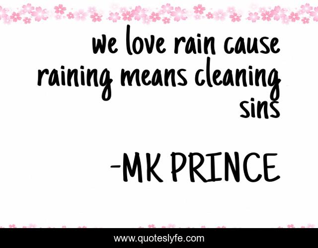 This page presents the quote "we love rain cause raining means cleaning sins". Author of this quote is MK PRINCE. This quote is about smile, happiness,.