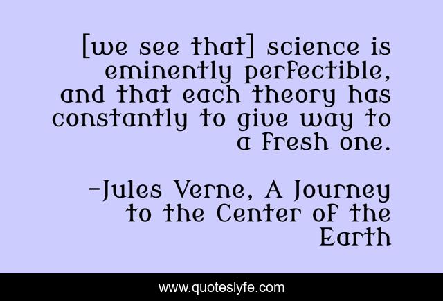This page presents the quote "[we see that] science is eminently perfectible, and that each theory has constantly to give way to a fresh one.". Author of this quote is Jules Verne, A Journey to the Center of the Earth. .