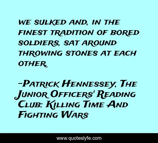 This page presents the quote "we sulked and, in the finest tradition of bored soldiers, sat around throwing stones at each other.". Author of this quote is Patrick Hennessey, The Junior Officers' Reading Club: Killing Time And Fighting Wars. This quote is about focus, community, distraction,.
