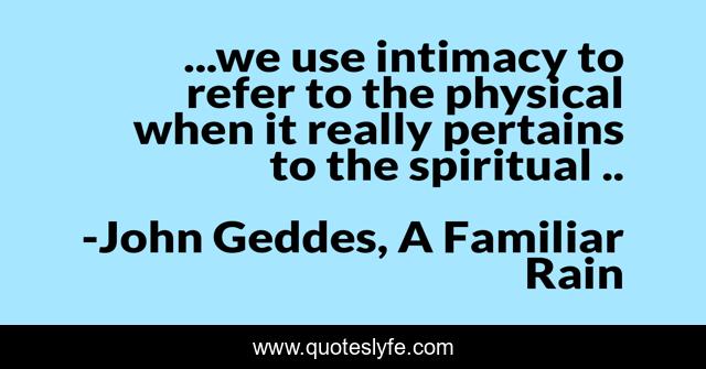 This page presents the quote "...we use intimacy to refer to the physical when it really pertains to the spiritual ..". Author of this quote is John Geddes, A Familiar Rain. This quote is about intimacy, spiritual, wisdom,.