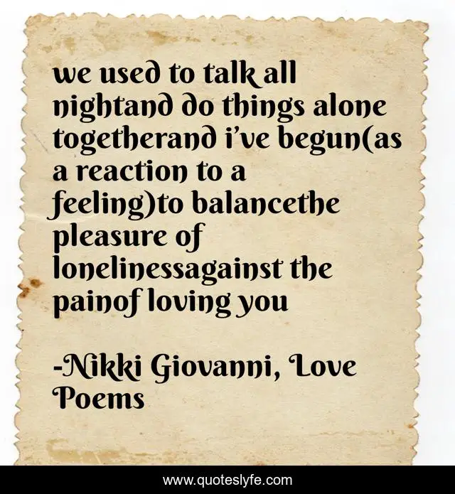 This page presents the quote "we used to talk all nightand do things alone togetherand i’ve begun(as a reaction to a feeling)to balancethe pleasure of lonelinessagainst the painof loving you". Author of this quote is Nikki Giovanni, Love Poems. This quote is about loneliness, solitude, love, affection,.