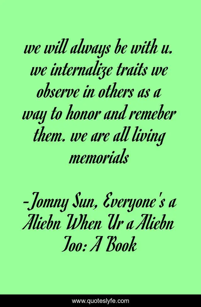This page presents the quote "we will always be with u. we internalize traits we observe in others as a way to honor and remeber them. we are all living memorials". Author of this quote is Jomny Sun, Everyone's a Aliebn When Ur a Aliebn Too: A Book. This quote is about enthusiasm, legacy, inspirational,.