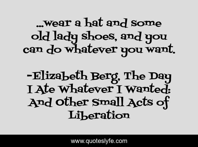 This page presents the quote "...wear a hat and some old lady shoes, and you can do whatever you want.". Author of this quote is Elizabeth Berg, The Day I Ate Whatever I Wanted: And Other Small Acts of Liberation. .