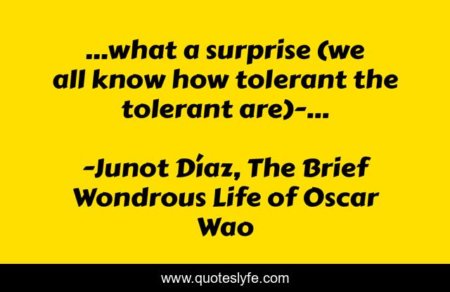 This page presents the quote "...what a surprise (we all know how tolerant the tolerant are)-...". Author of this quote is Junot Díaz, The Brief Wondrous Life of Oscar Wao. .