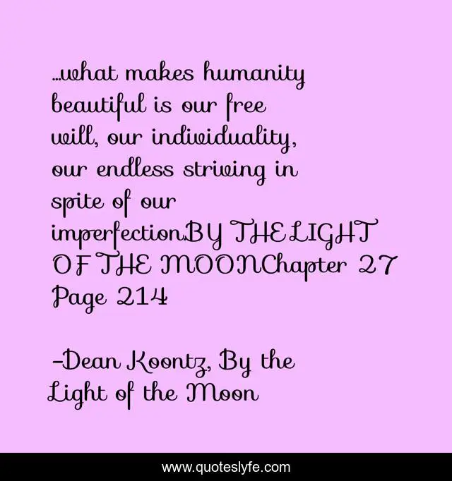 This page presents the quote "...what makes humanity beautiful is our free will, our individuality, our endless striving in spite of our imperfection.BY THE LIGHT OF THE MOONChapter 27 Page 214". Author of this quote is Dean Koontz, By the Light of the Moon. .