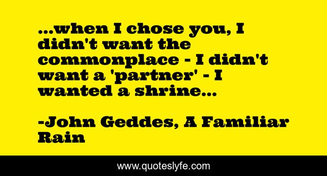 This page presents the quote "...when I chose you, I didn't want the commonplace - I didn't want a 'partner' - I wanted a shrine...". Author of this quote is John Geddes, A Familiar Rain. This quote is about shrine, adoration, priest, worship, choose,.