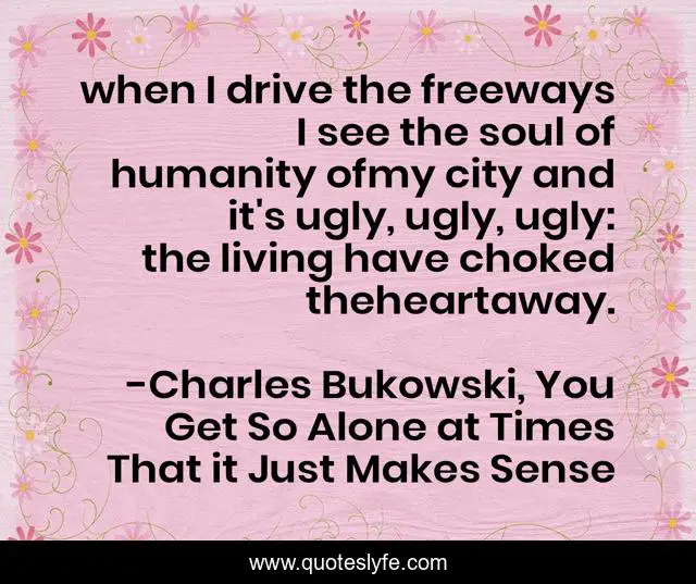 This page presents the quote "when I drive the freeways I see the soul of humanity ofmy city and it's ugly, ugly, ugly: the living have choked theheartaway.". Author of this quote is Charles Bukowski, You Get So Alone at Times That it Just Makes Sense. This quote is about heart, life, death, love, poem, poetry, soul, ugly, bukowski,.