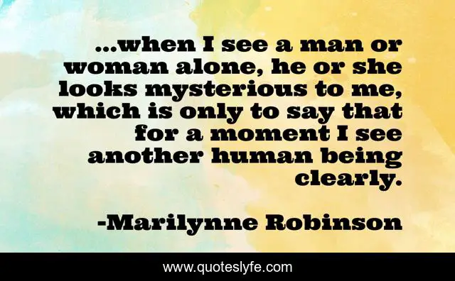 This page presents the quote "...when I see a man or woman alone, he or she looks mysterious to me, which is only to say that for a moment I see another human being clearly.". Author of this quote is Marilynne Robinson. This quote is about mystery, human-beings,.
