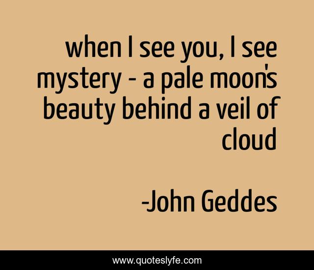 This page presents the quote "when I see you, I see mystery - a pale moon's beauty behind a veil of cloud". Author of this quote is John Geddes. This quote is about mystery, love, beauty, moon, cloud, affection,.